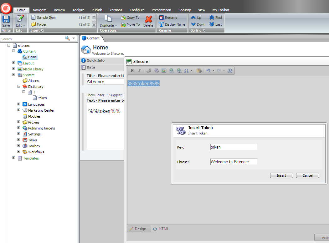 The module works by looking for a pattern in rendered fields. The pattern is %%([a-zA-Z0-9]+)%%. When a match is found, the token is looked up in a dictionary. If a match is found in the dictionary, the token is replaced with the value.